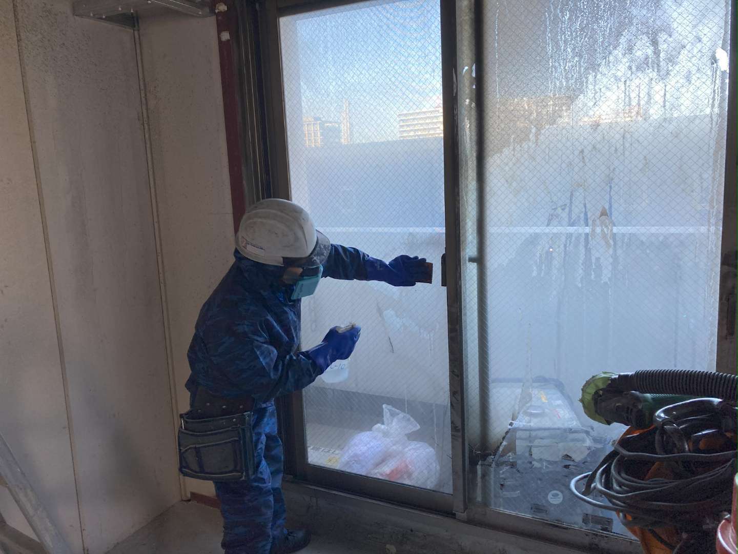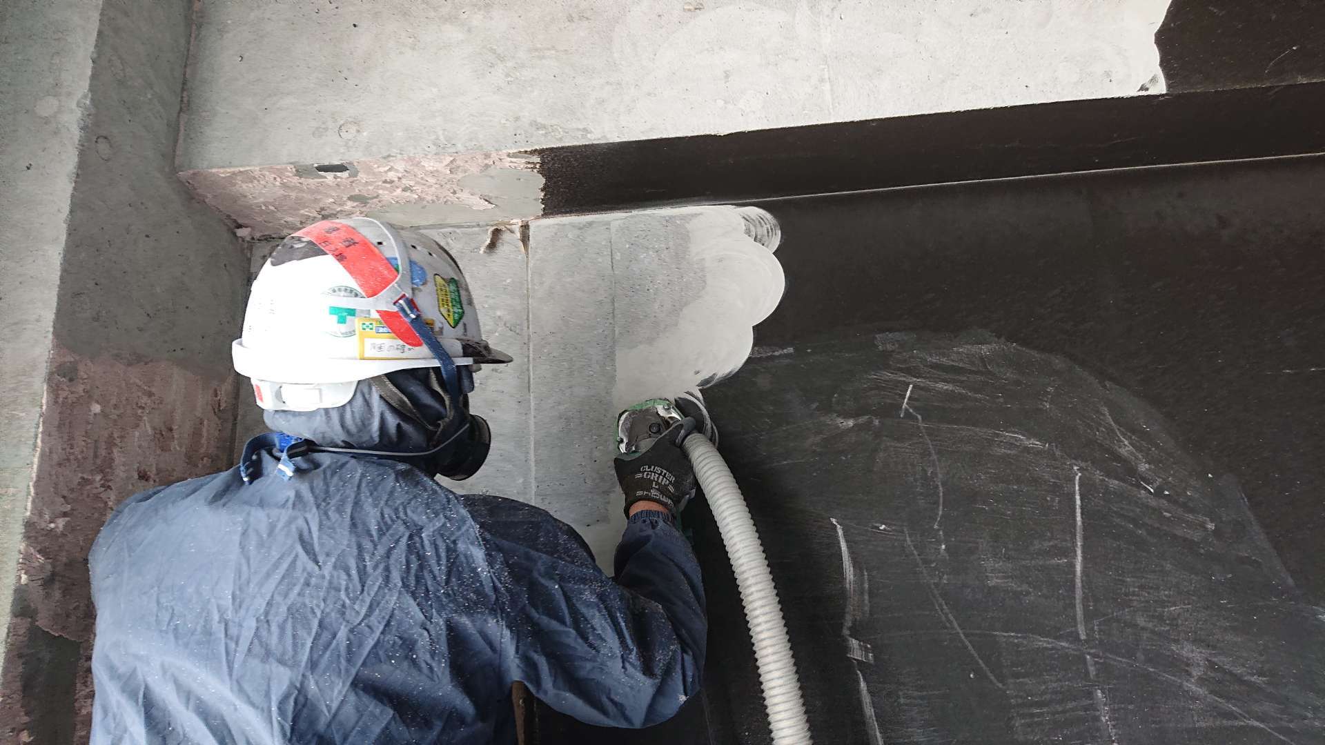 洗剤を使ってウエス等で煤を取ろうとすると煤を伸ばしてしまい、大変厄介なことになりかねません。まずは水分を含ませずに掃除機で煤を取ってやります。掃除機だけで取れない場合はサンダーに集塵機を付けて煤を取ってやります。